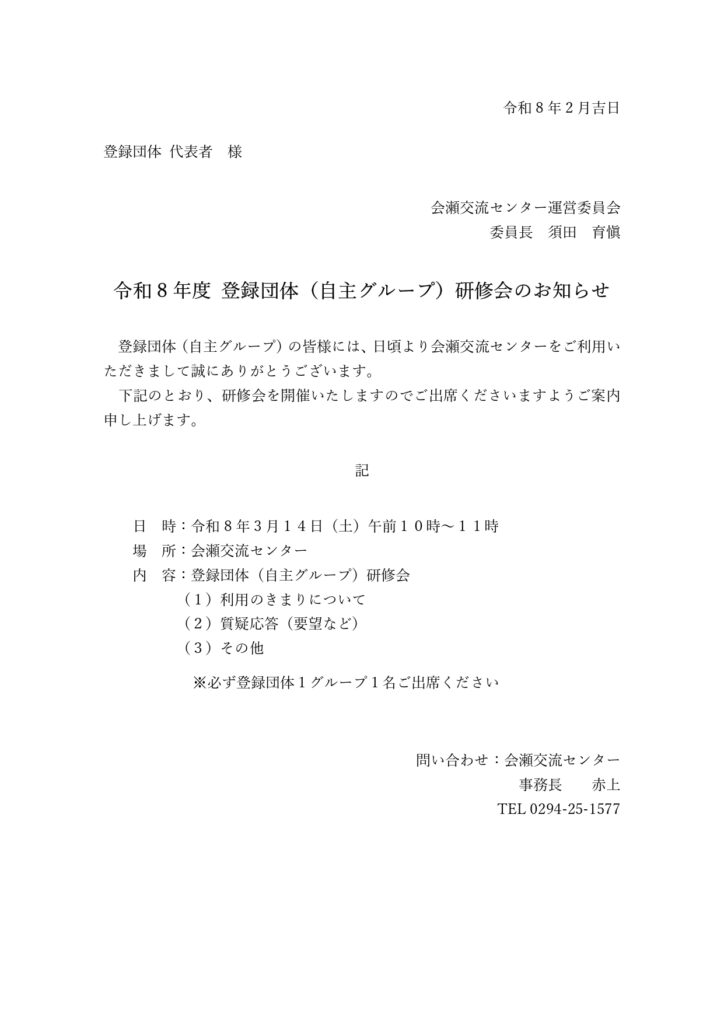 イベント ホーム > イベント > 令和8年度 登録団体(自主グループ)研修会のお知らせ 情報更新日: 2026 02.11 令和8年度 登録団体(自主グループ)研修会 イベント概要 イベント名 令和8年度 登録団体(自主グループ)研修会 一言 いつも会瀬交流センターをご利用いただきありがとうございます。 令和8年度 登録団体研修会を開催いたします。 各団体・グループ1名ご出席お願いいたします。 募集人数 費用 開催日 2026年3月14日(土) 前の記事へ 一覧にもどる