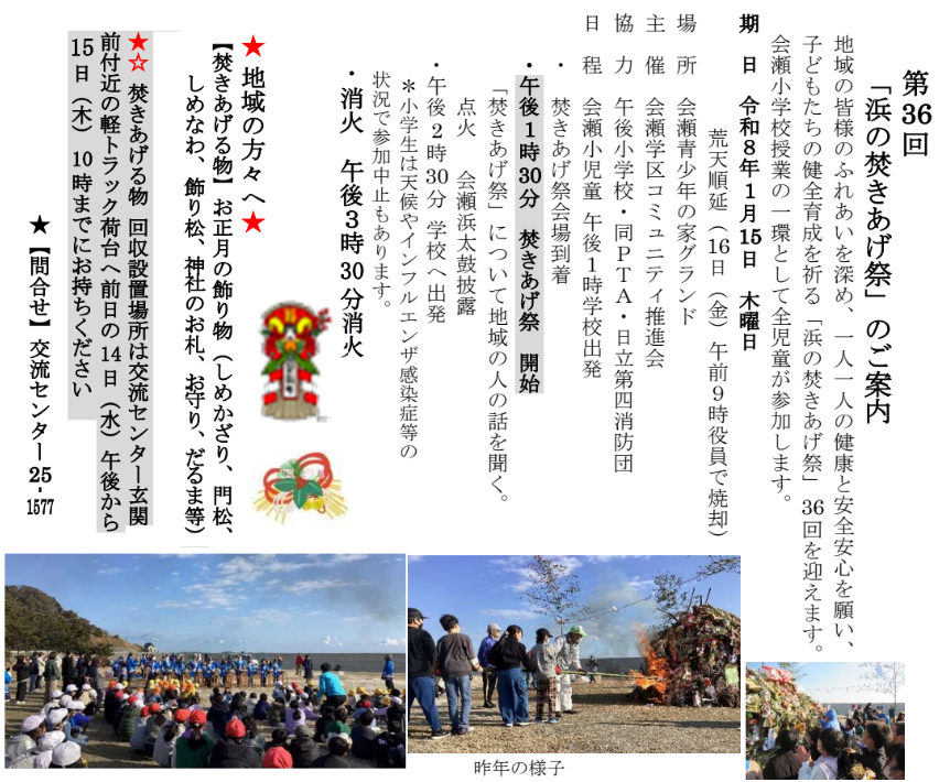 イベント ホーム > イベント > 第36回 浜の焚きあげ祭 情報更新日: 2026 01.05 第36回 浜の焚きあげ祭 イベント概要 イベント名 第36回 浜の焚きあげ祭 一言 毎年恒例の焚きあげ祭です。 本年も皆様の健康と安心安全をお祈りいたします。 募集人数 費用 無料 開催日 2026年1月15日㈭ 一覧にもどる 次の記事へ