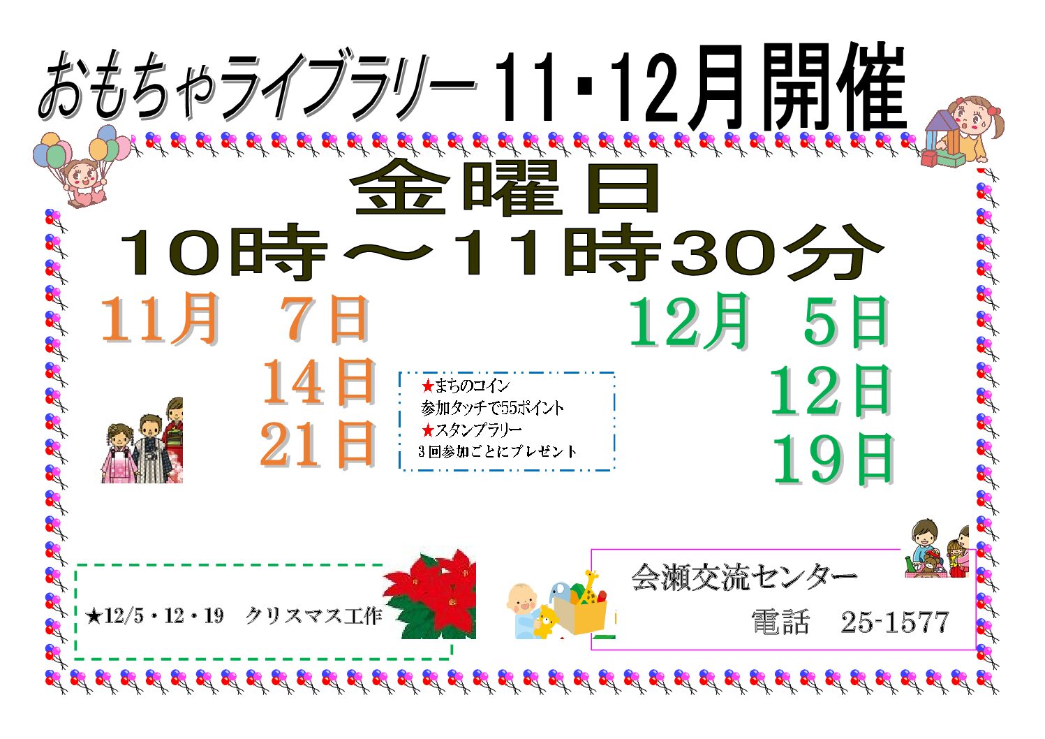 イベント ホーム > イベント > 金曜日おもちゃライブラリー 情報更新日: 2025 11.01 金曜日おもちゃライブラリー 会瀬交流センターおもちゃライブラリー 第1週~3週目(金) 3回参加ごとにプレゼントがあります🎁 イベント概要 イベント名 金曜日おもちゃライブラリー 一言 健康増進室 10時~11時30分 ☆2025年4月より月3回で開始時間が10時からに変更になりました。 ☆日時をご確認のうえ、遊びに来てくださいね☺ 募集人数 未就学児親子 費用 無料 開催日 2025年11月7,14,21日 一覧にもどる 次の記事へ